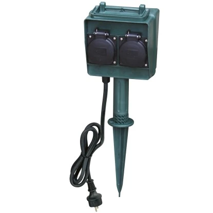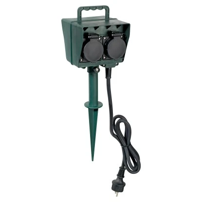 Die Außensteckdose 4-fach mit Erdspieß ist aus Kunststoff gefertigt und eignet sich für die Geräte in Ihrem Außenbereich mit bis zu 3.500 W Leistung. Sie besteht aus 4 Steckdosen und ist mit 1,5 m Anschlusskabel und Stecker versehen. Die Gartensteckdose ist gegen kleine Fremdkörper und Spritzwasser geschützt (IP 44).