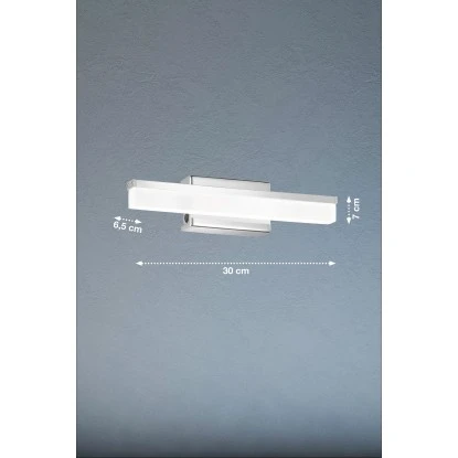 Mit dieser chromfarbenen Wandleuchte setzen Sie bewusst auf Lichtakzente. Das Acrylglas in weiß matt bietet blendfreies Licht und mit einer Länge von 30 cm und einer Ausladung von 7 cm ist diese Wandleuchte überall einsetzbar. Mit dem Schalter direkt an der Leuchte ist einfaches Ein- und Ausschalten gewährleistet. Bestückt wird dieser Artikel mit 1 x LED 6,5 Watt / 740 lm und 3000 K.