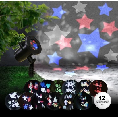 Dieser frostbeständige Laser-Projektor ausgestattet mit einem Erdspieß und einer Kabellänge von 5 Metern ist bis zu – 20 °C frostbeständig. Mitgeliefert werden 12 verschiedene Motivkarten, welche für beinahe jeden Anlass Ihr Eigenheim in besonderem Licht erstrahlen lassen. Freuen Sie sich auf außergewöhnliche Lichtspiele in Ihrem eigenen Garten.