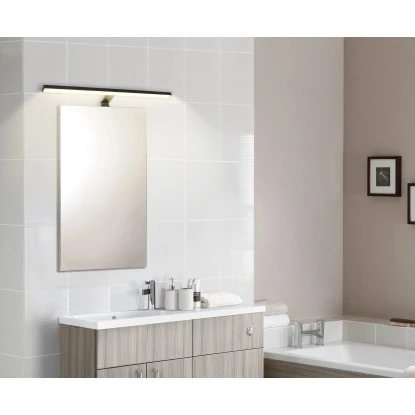 Diese moderne Wandleuchte eignet sich ideal für jeder Ihrer Räume. Aus einer schwarzen Metallbefestigung für die Wand ragt mit einem Überhang von 12 cm ein 60 cm langes LED Paneel, welches ein 4000 Kelvin neutrales Licht abgibt. Der IP44 Schutzgrad dient zum Schutz gegen Spritzwasser.