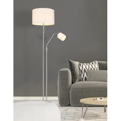Diese Stehlampe aus der Ava-Serie ist mit ihrem stilvollen Design aus nickel-mattem Metall und sandfarbenem Textil eine wunderschöne Ergänzung für Ihre Innenräume. Die 175 cm große Stehleuchte verfügt über einen größeren runden Textilschirm (Ø 40 cm) und einen kleineren Strahler, der ebenfalls mit einen Textilschirm versehen und schwenkbar ist. Beides können Sie mit jeweils einem E27-Leuchtmittel Ihrer Wahl bestücken, wodurch Sie die Möglichkeit haben, Lichtfarbe und Helligkeit nach Ihren Vorstellungen zu bestimmen. Durch weitere Artikel der gleichen Serie können Sie das Gesamtbild in Ihren vier Wänden komplettieren.