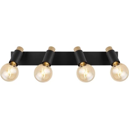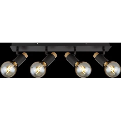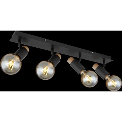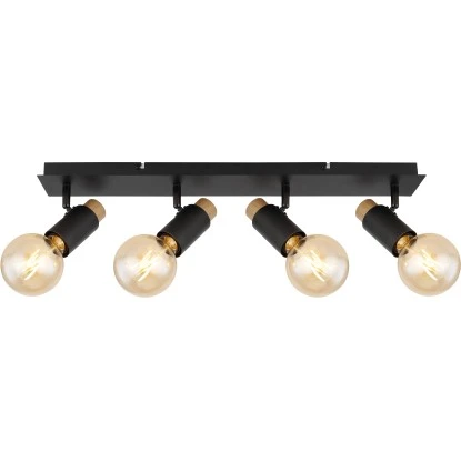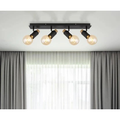Dieser schöne Strahler begeistert durch schlichtes Design. Aus einer schwarz matten rechteckigen Deckenbefestigung (8×65,5 cm) ragen vier drehbare Gelenke. An diesen befinden sich vier E27 Fassungen mit tollen Verzierungen in Holz und Metall. Die E27 Fassungen ermöglichen Ihnen bis zu einer maximalen Leistung von 40 Watt, selbst über Lichtfarbe und Helligkeit zu entscheiden. Aufgrund ihrer Langlebigkeit und Stromersparnis empfehlen wir LED Leuchtmittel.