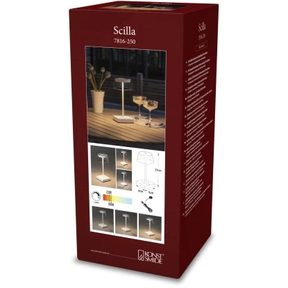 Die weiße USB-Tischleuchte Scilla von Konstsmide hat eine Größe von 27 cm x 11 cm x 11 cm und verfügt über einen 4400 mA leistungsstarken Lithium-Ionen-Akku. Sie verfügt über IP 54 Strahlwasserschutz und ist aus hochwertigem Aluminium gefertigt. Damit trotzen sie dauerhaft Wind und Wetter.