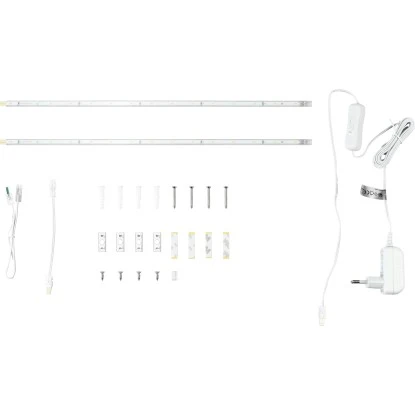 Die stabförmige Unterbaubeleuchtung ist im modernen Slim-Design gehalten. Dadurch nimmt das Gehäuse nur wenig Platz ein und fügt sich unaufdringlich in viele Einrichtungen ein. Dabei können die Streifen in einer Reihe oder in einer Winkellösung montiert werden. Integriert ist eine fortschrittliche LED-Leuchtmitteltechnologie, die mit einer Leistung von 3,2 W bei 240 lm überzeugt. Dank des großzügigen Abstrahlwinkels von 360° erhalten Sie eine weite Ausleuchtung. Die Lichtfarbe ist ein angenehmes Warmweiß mit 3.000 K. Über den eingebauten Wippschalter können Sie die Schrankbeleuchtung komfortabel ein- und ausschalten. Ausgestattet ist sie mit einer Kabelverbindung sowie einem Trafo und einer 2 m langen Zuleitung mit Netzstecker für die 230 V-Steckdose.