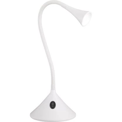 Die LED-Tischleuchte Viper besticht besonders durch ihre Flexibilität. Aus weißem Kunststoff gefertigt, kann sie sowohl als Tischleuchte als auch als Wandleuchte verwendet werden. Der flexible Hals der Leuchte lässt sich nach Ihren persönlichen Wünschen ausrichten, sodass der Lichtkegel auch nach der Montage noch verstellt werden kann. Die fest verbauten LED-Leuchtmittel haben 3 Watt und eine Lichtfarbe von 3000 Kelvin.