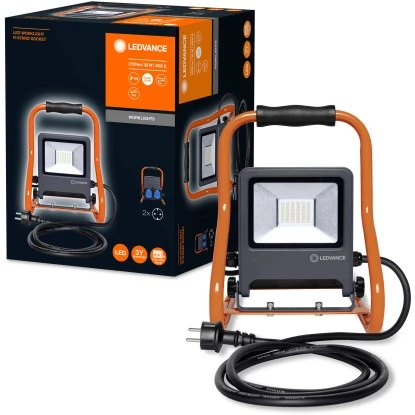 Das Ledvance LED-Arbeitslicht Worklight R-Stand mit Steckdosen (Gen 2) 30 W/4000 K ist ein flexibles, tragbares Arbeitslicht mit eingebauten Steckdosen. Es ist ausgestattet mit zwei Steckdosen, für bis zu 3000 W Anschlussleistung. Die Steckdose ist mittels selbst schließender Abdeckung geschützt. Die Lampe verfügt über einen eingebauten Schalter zur Leuchtensteuerung, die Steckdosen bleiben dauerhaft versorgt. Zudem besitzt sie einen Schnellverschluß zur Verstellung des Leuchtenkopfwinkels und ein 3 m Kabel mit Stecker vom Typ E/F.