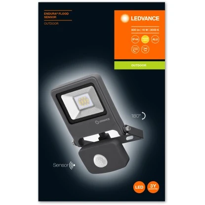 Die Ledvance LED-Außenleuchte Endura Flood mit Sensor 10 W 3000 K Dunkelgrau ist eine sehr helle und funktionelle LED-Außenleuchte. Sie produziert einen symmetrischen Ausstrahlungswinkel von 110 ° x 110 °. Außerdem besitzt sie einen Montagebügel mit Rotationsbereich von bis zu 180 °. Sie ist dank der Schutzart IP44 für den Außenbereich geeignet und hält Umgebungstemperaturen bei Betrieb von -10 bis +40 °C aus. Für die Installation ist der Anschluss über ein Kabel (1 m) und eine Verdrahtung erforderlich. Die Lampe besitzt einen einstellbaren IR-Tageslicht- und Bewegungssensor mit einer Reichweite von bis zu 9 m.