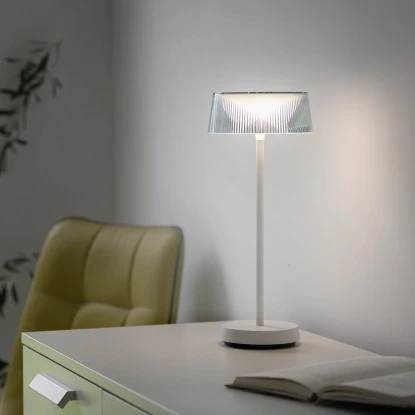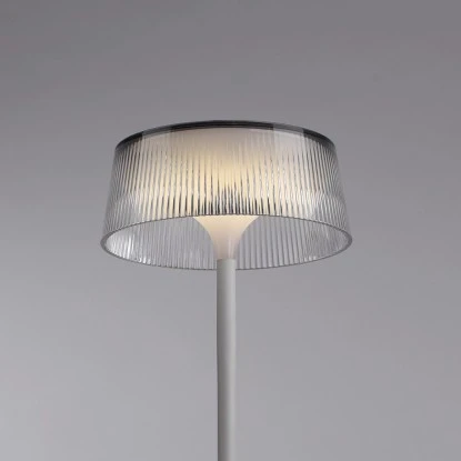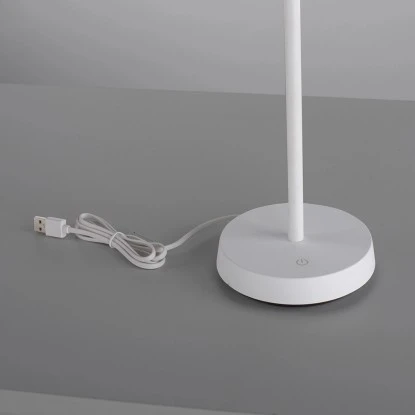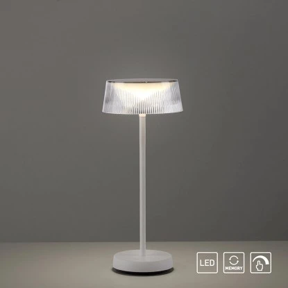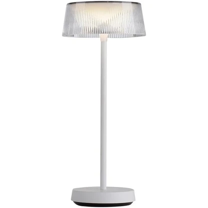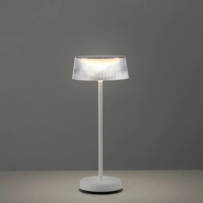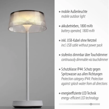 Die Tischleuchte ist eine akkubetriebene Outdoor Leuchte, die Ihren Balkon oder Ihre Terrasse in ein stimmungsvolles Ambiente verwandelt. Der Leuchtenfuß und das Gestell sind in einem eleganten Weiß gehalten, während der konische Schirm aus transparentem Kunststoff besteht, der eine riffelige Oberfläche aufweist. Das Design verleiht der Leuchte eine moderne und ansprechende Optik.