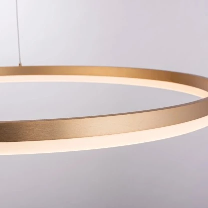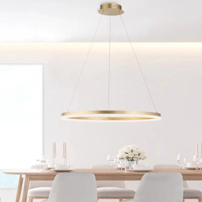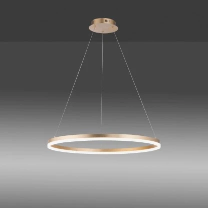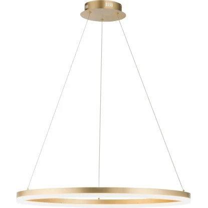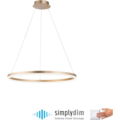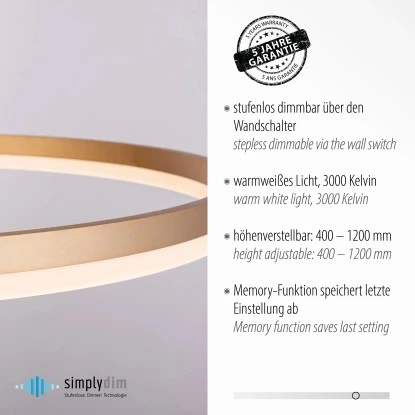 Die LED Hängeleuchte Titus besticht durch ihr schlichtes, modernes Design. Die LED Pendelleuchte in der Farbe Messing wird mit einem LED-Leuchtmittel geliefert. Die Farbtemperatur des Leuchtmittels wirkt mit 3000 Kelvin angenehm warmweiß und ist dabei auch sehr wohnlich und gemütlich. Die Lampe ist mit einer stufenlosen Dimmer-Technologie „simply dim“ ausgestattet. Simply dim macht es möglich, dass man die Leuchte über einen vorhandenen Lichtschalter, ganz egal ob Kipp-, Zug-, Schnur- oder Wandschalter, dimmen kann. Die Dimmer-Technologie steuert die Helligkeit über den Schaltimpuls und so kann die Pendellampe von 100% bis runter auf 10% der Lichtintensität stufenlos gedimmt werden. Wird die Leuchte weniger als 3sek. nach dem Ausschalten wieder angeschaltet, startet der Dimmvorgang. Hat sie den hellsten (100%) bzw. dunkelsten Wert (10%) erreicht, verweilt sie ca. 2sek. auf dieser Einstellung, um den Vorgang abermals zu starten. Erstrahlt die Leuchte während eines Vorgangs in der gewünschten Helligkeit, kann man durch Ausschalten der Leuchte die Lichtintensität abspeichern. Schaltet man die Leuchte nun wieder an, scheint die Leuchte in der gespeicherten Helligkeit und diese Einstellung bleibt erhalten. Die einfache Handhabung der Pendellampe sorgt dafür dass diese Leuchte schnell einen geeigneten Einsatzort findet. Über den verbauten Reutlinger Verschluss kann man die Abhängung der Leuchte seinen Räumlichkeiten anpassen. Mit einem Durchmesser von 80,0 cm lässt die Lichtquelle Ihren Esstisch gekonnt in Szene setzen ganz gleich ob dieser in der Küche oder im Esszimmer steht.