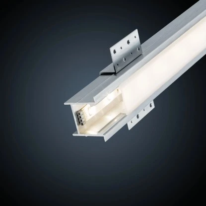 Das Deep Profil erzeugt ein gleichmäßiges Lichtband zur optischen Trennung unterschiedlicher Wandbeschaffenheiten oder Vertäfelungen. Es eignet sich ideal für eine moderne und architekturbetonte Wandgestaltung. Ausgelegt ist das Profil für den Trockenbau mit Standard-Gipskarton und Ständerwerk. Es wird mit Cliphaltern fixiert und mit einem LED-Strip nach Wahl versehen. Auch eine nachträgliche Wartung ist problemlos möglich, da sich das Profil wieder aus den Halterungen lösen lässt.