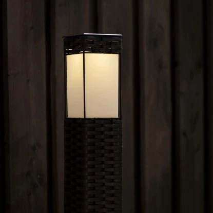 Die Solar-Wegeleuchte Muscat 5 lm 2700 K IP44 Sensor Schwarz strahlt eine warmweiße Farbe aus, die nicht flackert, und verfügt über einen Timer, der die Lampe automatisch zur eingestellten Zeit einschaltet und nach fünf Stunden automatisch wieder ausschaltet.