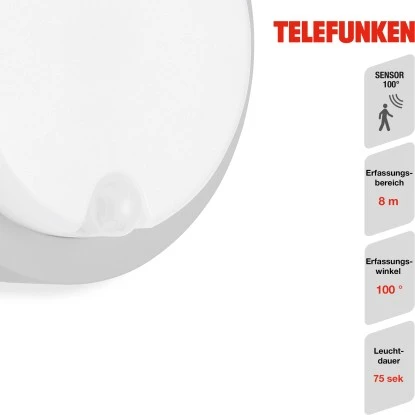 Die silberfarbige Telefunken Außenleuchte Dortmund hat durch den integrierten Sensor eine besonders schöne Optik. Der Sensor hat eine voreingestellte Leuchtdauer von 75 Sekunden. Die Reichweite beträgt maximal 8 Meter und der Erfassungswinkel 100°. Der Sensor hat außerdem einen integrierten Dämmerungssensor.