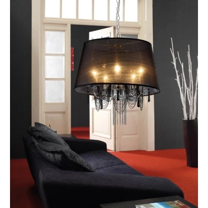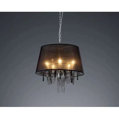 Mit diesem edlen, 5-flammigen Kronleuchter in Charleston-Stil sorgen Sie für ein besonderes Ambiente in Ihren Räumen. Die Leuchte hat einen chromfarbenen Baldachin und einen schwarzen Gewebeschirm mit einem Durchmesser von ca. 50 cm. Die Leuchte ist mit fünf E14 Fassungen für jeweils maximal 40 Watt ausgelegt. Die passenden Leuchtmittel sind separat erhältlich.